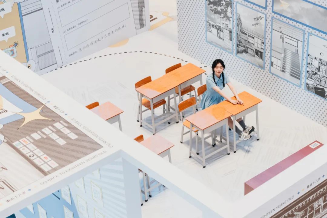 最讓我們感到驚喜的是,這次展覽重現(xiàn)了學(xué)生時代的教室場景。當(dāng)我們走進(jìn)這個教室,看到熟悉的課桌椅,從前備戰(zhàn)高考時的生活點滴恍惚間又重回眼前。